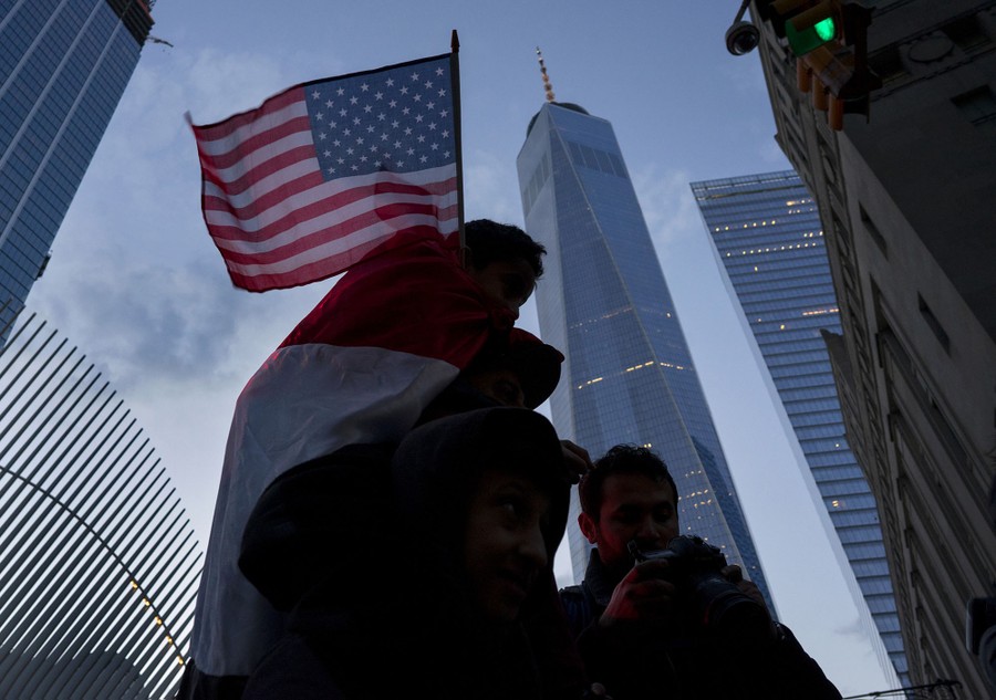Read moreWith One World Trade Center in the background, people march in New York, on January 29, 2017, as they protest against President Donald Trump's executive order banning travel to the U.S. by citizens of several countries. #
