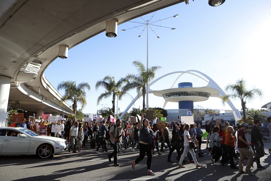 Read moreDemonstrators march on the lower roadway at Los Angeles International Airport, on January 29, 2017, as protests against President Donald Trump's executive order banning travel to the U.S. by citizens of seven countries. #