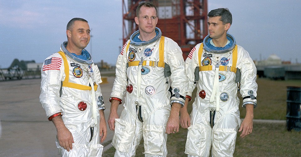 Read moreFrom left, veteran astronaut Virgil Grissom, first American spacewalker Ed White and rookie Roger Chaffee, stand for a photograph at Cape Kennedy, Florida. During a launch pad test on January 27, 1967, a flash fire erupted inside their capsule killing the three Apollo crew members. #