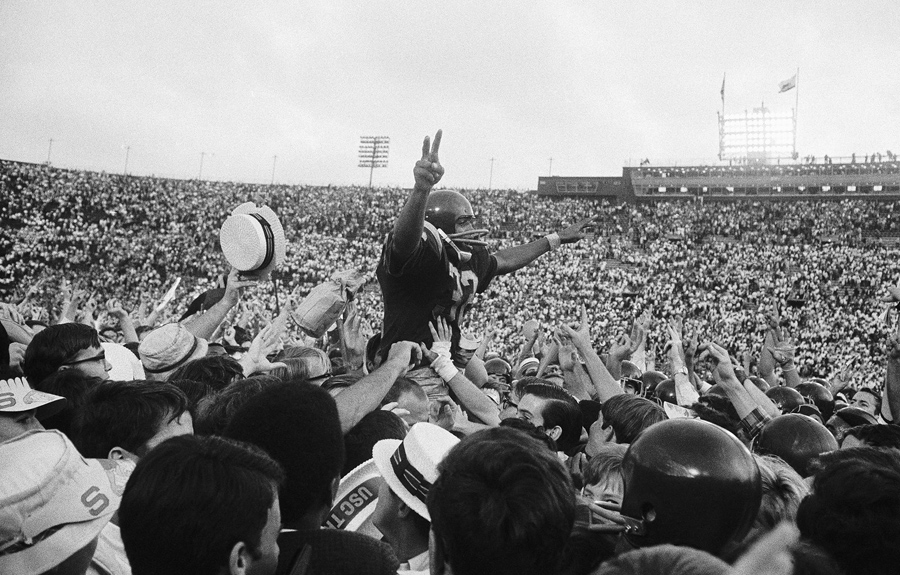 Read moreO.J. Simpson, University of Southern California's running back, gives the victory sign as he is carried off the field by hundreds of cheering fans. Simpson scored two touchdowns, helping USC to beat UCLA, 21-20. #