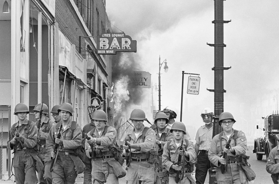 Read moreOriginal Caption: Tough-looking Michigan National Guardsmen push rioting Negroes back from a burning building with fixed bayonets on Detroit's riot-torn west side on July 26, 1967. National Guard tank crews blasted away at entrenched snipers with .50-caliber machine guns early July 26 after sniper fire routed policemen from a square-mile area of the motor city. #