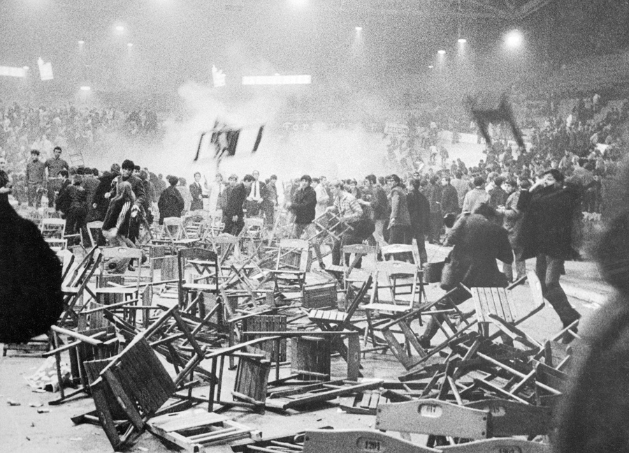 Read moreOriginal caption: About 12,000 fans turned out for a performance by the Rolling Stones on their first visit to Zurich on April 16, 1967. All of a sudden, "chaos." The tumult started when several frenzied fans tried to climb onto the stage. One of them fell, resulting in a skull fracture. Suddenly hundreds of fans "joined in" and started smashing stools and furniture, followed by various smoke bombs. During the performance and melee, 250 policemen and 150 security guards understandably were kept quite busy. Fifteen fans were arrested and ten were injured. Here pandemonium,.as furniture is broken and smoke bombs fill the air. #
