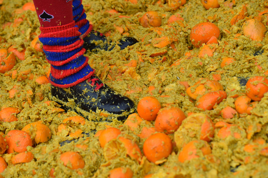 Read morePeople throw fruit at each other in the traditional "battle of the oranges" during the carnival in Ivrea, Italy, on February 26, 2017. During the event, which marks the people's rebellion against tyrannical lords who ruled the town in the Middle Ages, revelers parading on floats represent guards of the tyrant, while those on foot the townsfolk. #