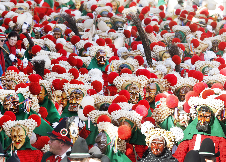 Read moreA young "Federahannes," a jester figure from Rottweil, Germany, participates in the "Narrensprung" (jester jump) parade. About 4,000 jesters paraded through the city among thousands of spectators. #