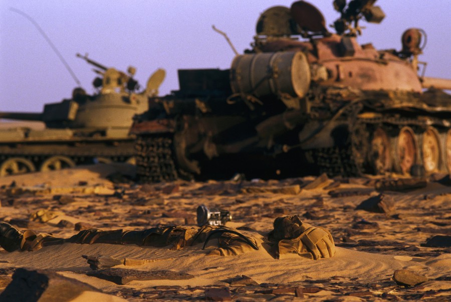Read moreThe corpse of a Libyan soldier lies buried in the sand near Libyan army tanks captured by Forces Armees Nationales Chadiennes (FANT), or National Army of Chad. The FANT mission in early 1987 was to reconquer the Borkou-Ennedi-Tibesti Prefecture and recover the territory in northern Chad that had been under Libyan control. #
