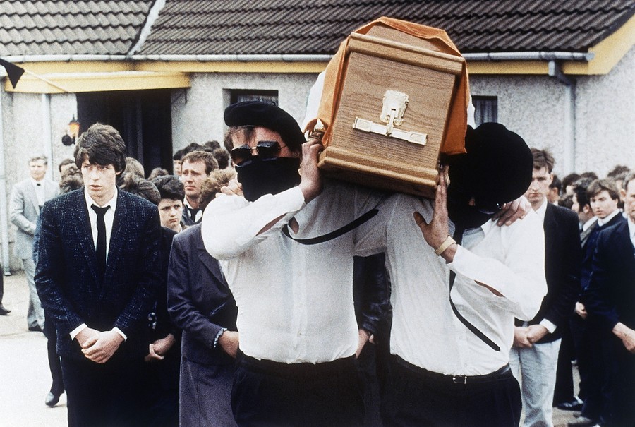 Read moreTwo men wearing Irish Republican Army (IRA) black masks and berets carry the coffin of Tony Gormley, during his funeral near Dungannon, Northern Ireland on May 11, 1987. He was one of eight IRA members who died on May 8, after conflict with security forces when they attacked the police station at Loughgall in Co., Armagh. #