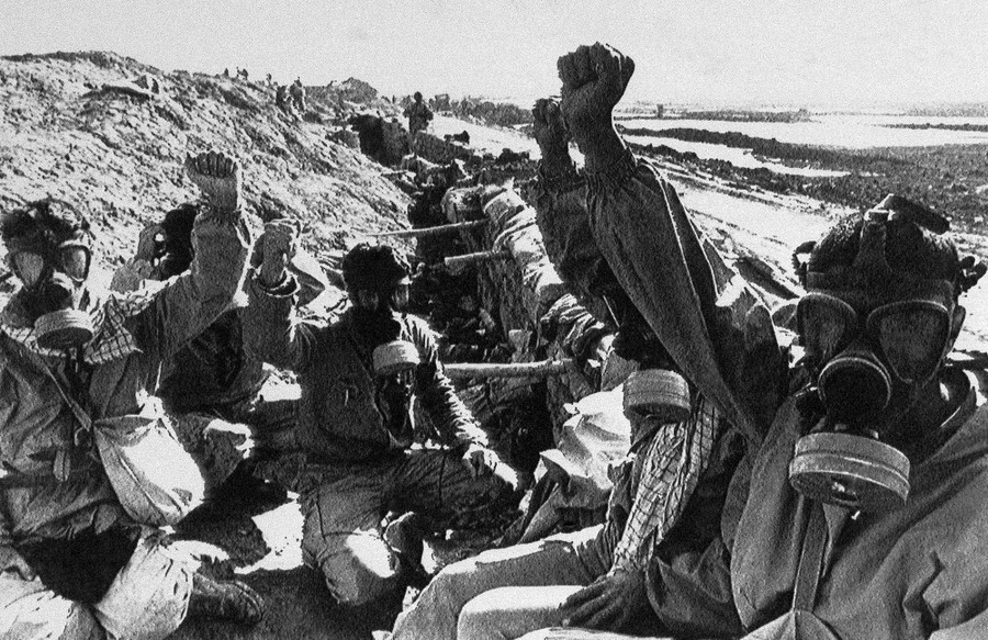 Read moreIranian soldiers wear gas masks near a canal in the Shalamcheh area, southeast of Basra, Iraq, on January 16, 1987. Iraqi dictator Saddam Hussein was accused of using mustard gas and the nerve agent taubun in his country's war with neighboring Iran as well as his 1987-88 crackdown on Iraq's Kurdish minority. #