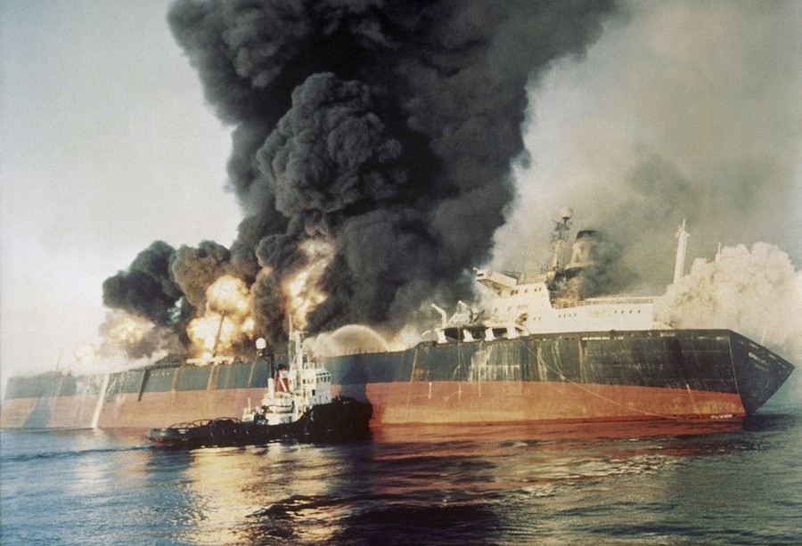 Read moreThe Singapore-registered tanker "Norman Atlantic" sits ablaze in the Straits of Hormuz on December 6, 1987, after being attacked by an Iranian gunboat. The 86,129 ton tanker was carrying a cargo of naphtha liquid gas from Kuwait. All 22 crewmen left the ship and no injuries were reported. #