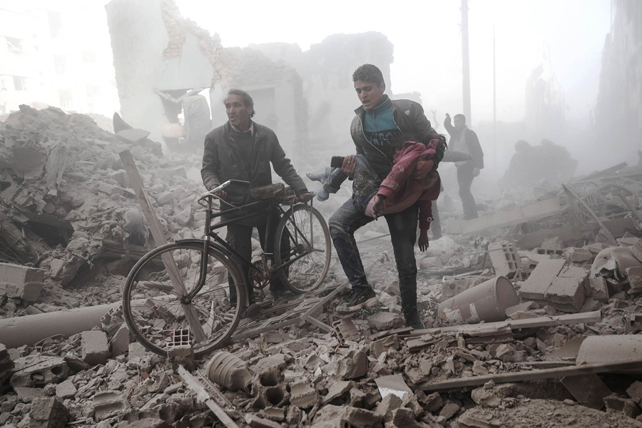 Read moreA young Syrian man carries a wounded child following reported government airstrike on the rebel-held town of Douma, on the eastern outskirts of the capital Damascus, on February 25, 2017. Syrian regime forces carried out raids on several areas in the country, targeting mainly the besieged town of Douma, causing the deaths of at least 13 civilians, according to Syrian Observatory for Human Rights. #