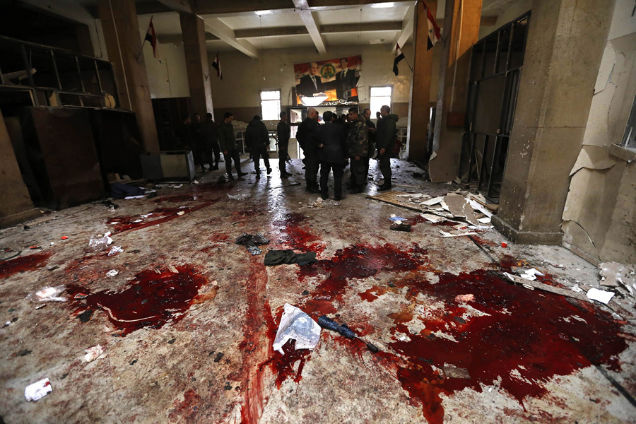 Read moreSyrian security forces inspect the scene of a reported suicide bombing at the old palace of justice building in Damascus on March 15, 2017. Two suicide bombings hit Damascus including the attack at the central courthouse that left at least 32 dead, as Syria's war entered its seventh year with the regime now claiming the upper hand. #