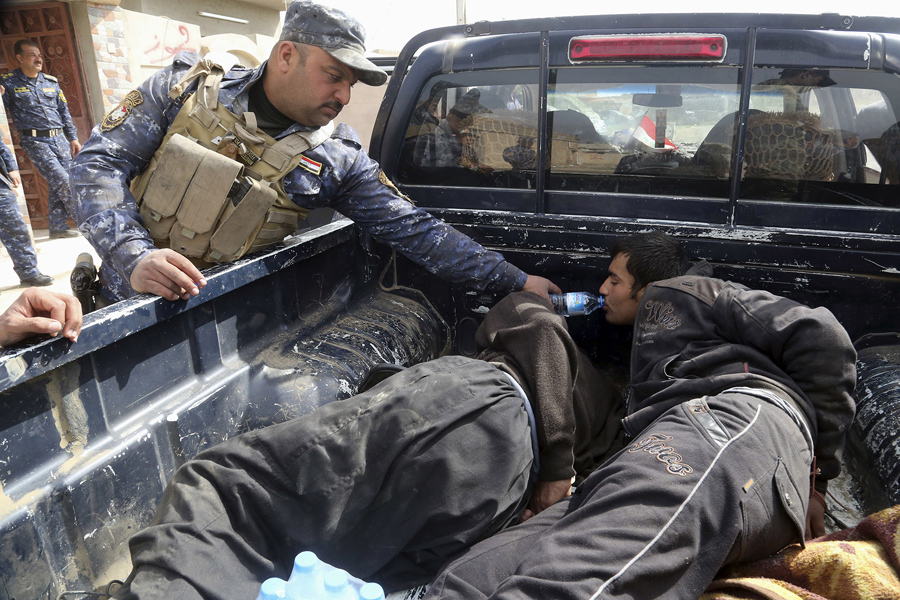 Read moreAn Iraqi Federal policeman gives water to one of two handcuffed suspected ISIS militants after they were arrested inside their home on the western side of Mosul on February 27. 2017. #