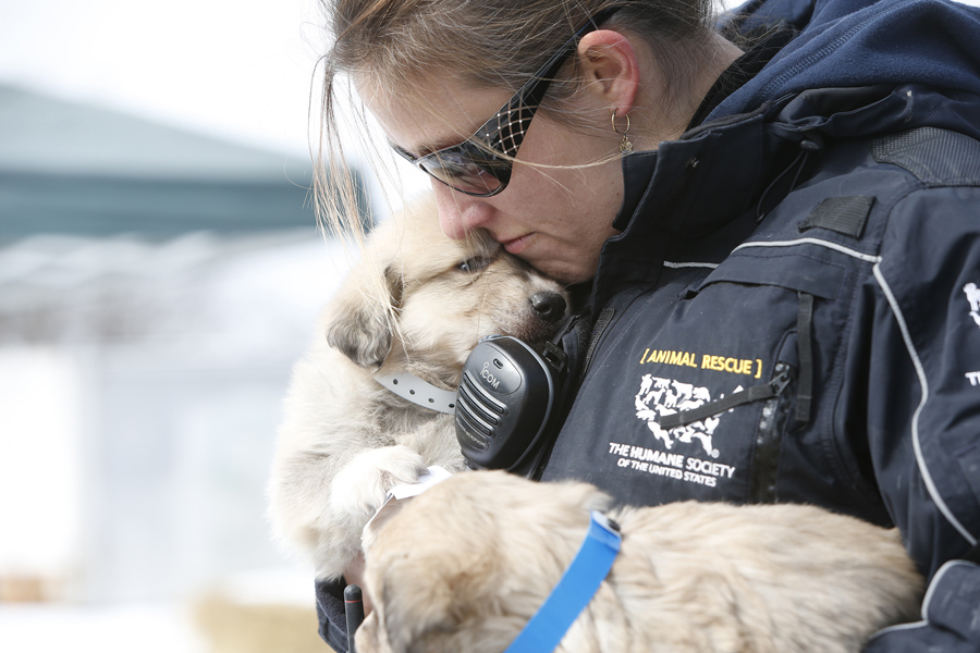 Read moreSára Varsa, Director of Cruelty and Response with The Humane Society of the United States (HSUS), comforts two rescued puppies. 46 dogs and 11 other animals were rescued from a suspected puppy mill in Warm Springs, Arkansas. The HSUS and other area organizations assisted the Randolph County Sheriff’s office in the rescue of mostly Great Pyrenees dogs. Many of the dogs were found outdoors, without any protection from the freezing cold, while others were living on piles of feces and urine inside the home. Some were suffering so severely they needed immediate medical care. Others were emaciated and so matted they couldn’t move. All of the dogs were removed from the property and thoroughly examined by a team of veterinarians. They received any needed immediate medical treatment at the Humane Society of Saline County. #