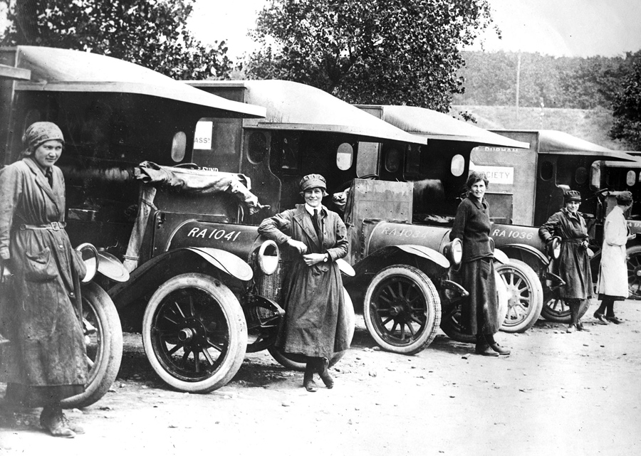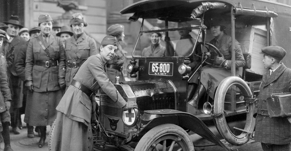 Read moreOriginal caption: "Women are shown preparing to deliver various government packages. They are members of the National League for Women's Service, which is proving of great assistance to Uncle Sam in carrying on the Great War. Women are employed as drivers, ambulance drivers, messengers, etc. Captain A.B. Bayle is shown cranking the car, prior to making her rounds in New York." #
