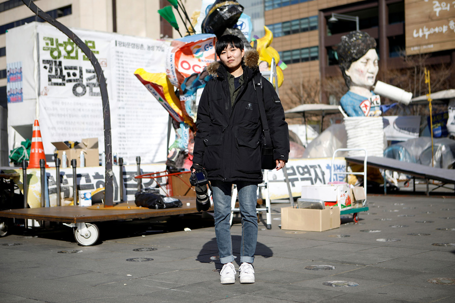 Read moreJeung Un, 27, a freelance photographer, poses for a portrait at a site which protesters have occupied, in central Seoul, South Korea, on February 23, 2017. "Most news outlets prefer to employ male photographers. I feel strongly about gender inequality. When I cover violent scenes, sometimes I am harassed and hear sexually-biased remarks," Un said. #