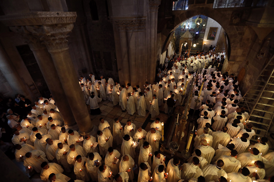 Read moreLatin Catholic clergymen hold candles as they circle the Anointing Stone during the Holy Thursday (Maundy Thursday) mass at the Church of the Holy Sepulchre in Jerusalem's Old City on April 13, 2017. #