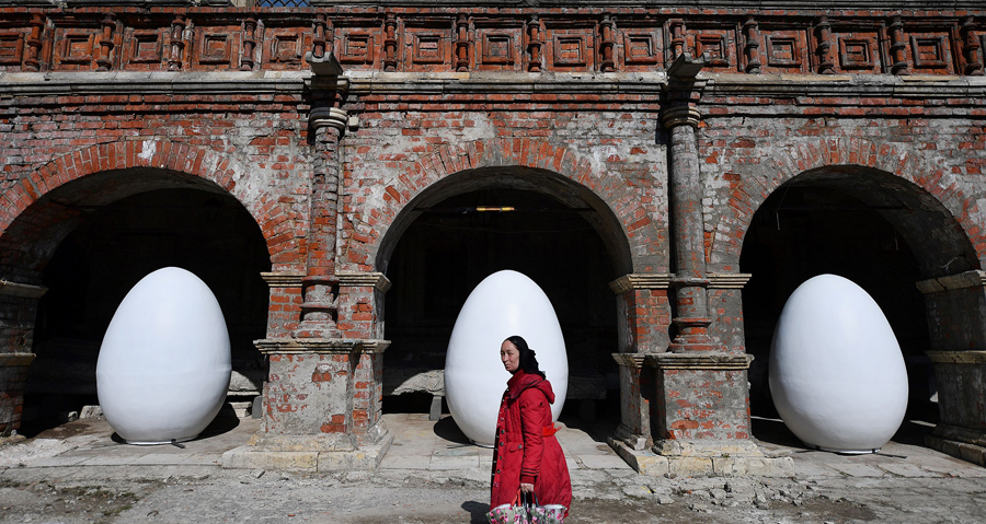 Read moreA woman walks past giant egg decorations set up in the center of Moscow on April 11, 2017, days ahead of Russian Orthodox Easter celebrations. This year's Orthodox Easter falls on April 16, 2017. #