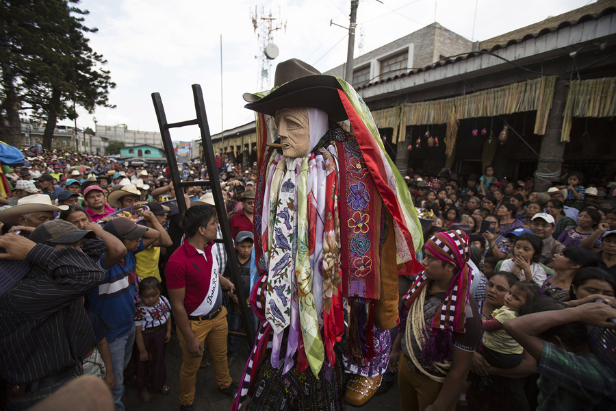 Read moreThe folk saint Maximon arrives at the town hall, surrounded by worshipers in Santiago Atitlan, Guatemala, on April 12, 2017. Worshipers take part in the procession of the saint venerated mostly by Mayan indigenous communities in the highlands of Western Guatemala as part of Holy Week celebrations. #