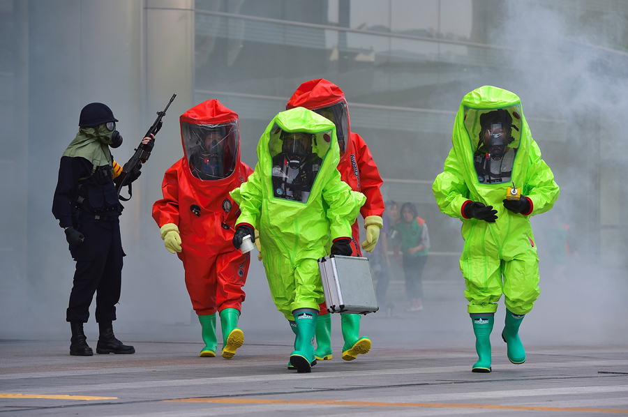 Read moreSouth Korean rescue members wearing chemical protective suits participate in an anti-terror drill as part of a disaster management exercise at the COEX shopping and exhibition center in Seoul on May 20, 2016. #