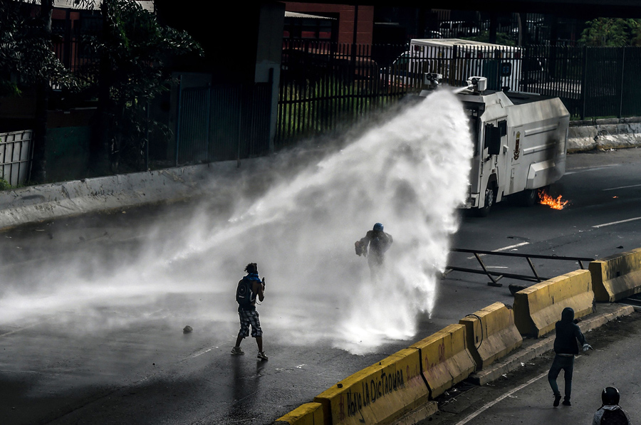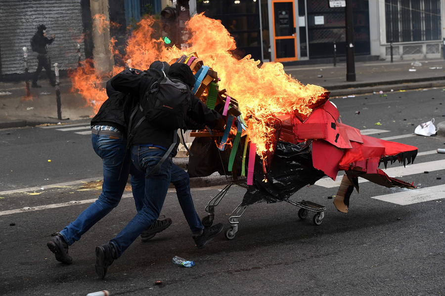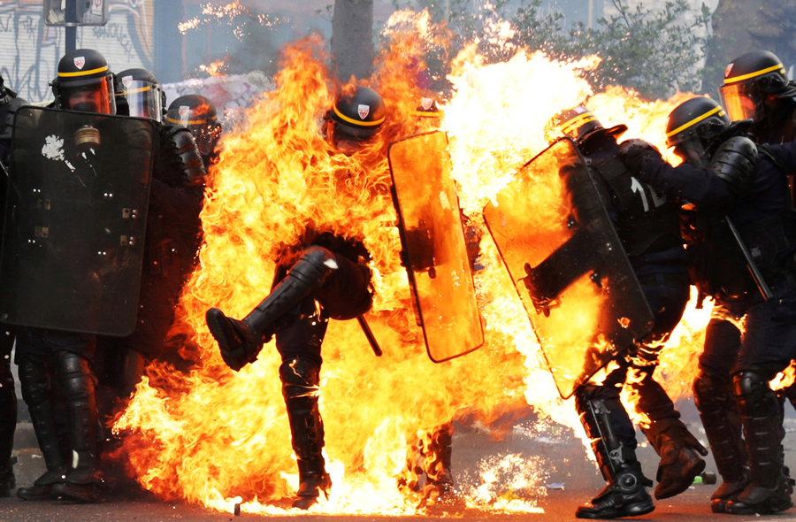 Read moreFrench CRS anti-riot police officers are engulfed in flames as they face protesters during a march for the annual May Day workers' rally in Paris on May 1, 2017. The march was disrupted as scores of hooded youths threw firebombs at riot police in full gear, who responded with tear gas and truncheons. #