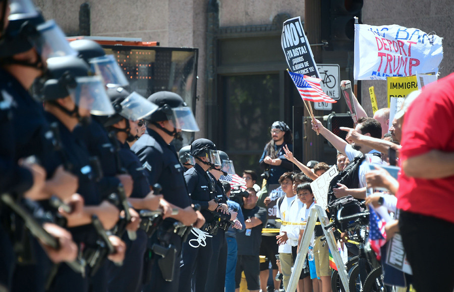 Read moreKept behind police tape, supporters and opponents of US President Donald Trump were separated by a line of police as May Day marchers converged on downtown Los Angeles, California, on May 1, 2017. #