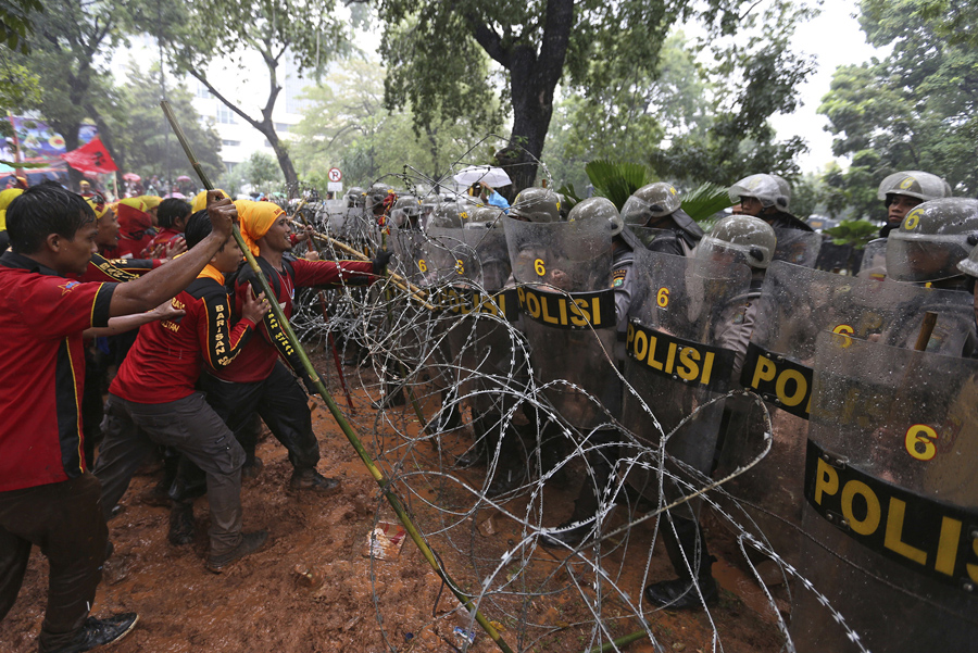 Read moreWorkers try to remove razor wire which prevents them from marching towards the presidential palace as riot police take defensive positions during a May Day rally in Jakarta, Indonesia, on May 1, 2017. Thousands of workers attended the rally urging the government to raise minimum wages, ban outsourcing practices, provide free health care and improve working condition for workers in the country. #