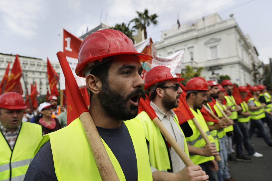 Read moreProtesters wearing red helmets chant slogans as they take part in rally outside the Greek parliament ,in Athens, Greece, on May 1, 2017. Several thousand protesters gathered outside Greece's parliament as May Day rallies kicked off around the country, and unions braced for more austerity measures imposed by bailout lenders. #