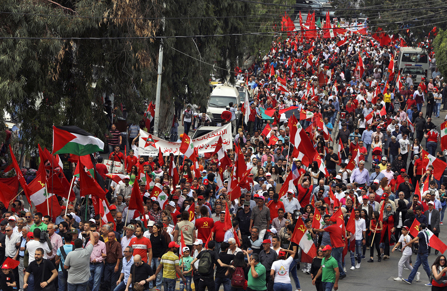 Read moreMore than 2,000 members and supporters of the Lebanese Communist party wave Lebanese flags with Communist symbols, during a demonstration to mark International Labor Day or May Day, in Beirut, Lebanon, on May 1, 2017. #