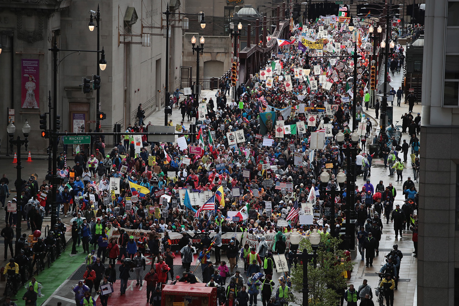 Read moreDemonstrators participate in a May Day march through downtown Chicago, Illinois, on May 1, 2017. May Day, also known as International Worker's Day, originated in Chicago when labor leaders staged a series of rallies and marches in May of 1886 to demand an eight-hour work day. #