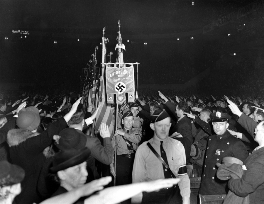 In the years before the outbreak of World War II, people of German ancestry living abroad were encouraged to form citizens groups to both extol “German virtues,” around the world, and to lobby for causes helpful to Nazi Party goals. In the United States, the Amerikadeutscher Volksbund, or German American Bund, was formed in 1936 as “an organization of patriotic Americans of German stock,” operating about 20 youth and training camps, and eventually growing to a membership in the tens of thousands among 70 regional divisions across the country. On February 20, 1939, the Bund held an “Americanization” rally in New York’s Madison Square Garden, denouncing Jewish conspiracies, President Roosevelt, and others. The rally, attended by 20,000 supporters and members, was protested by huge crowds of anti-Nazis, who were held back by 1,500 NYC police officers. As World War II began in 1939, the German American Bund fell apart, many of its assets were seized, and its leader arrested for embezzlement, and later deported to Germany.