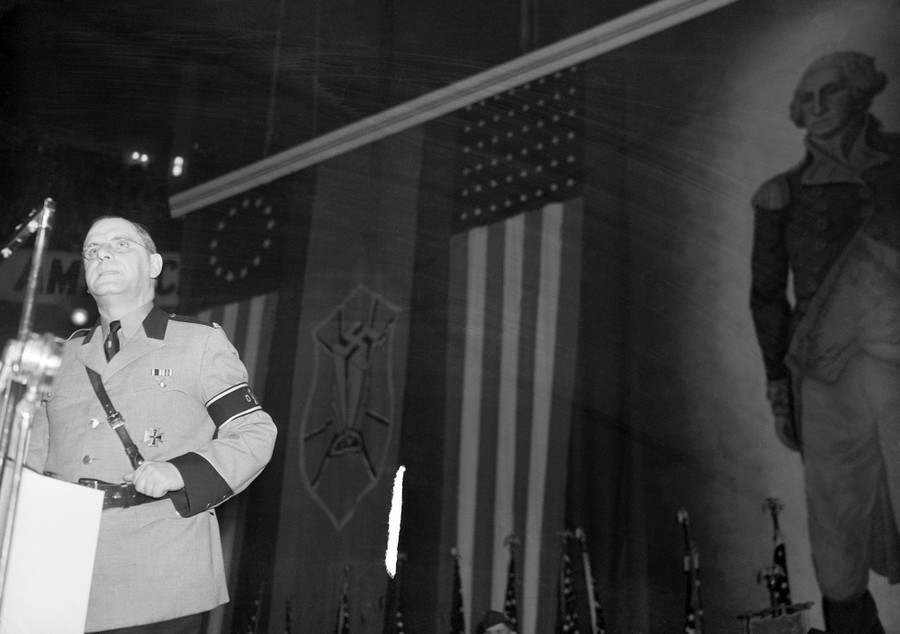Read moreOriginal Caption: Fritz Kuhn, in the full uniform of a Storm Trooper, national leader of the Bund gestures from the rostrum at Madison Square Garden in New York, on February 20, 1939 while he uttered imprecations against Jews over and over. #