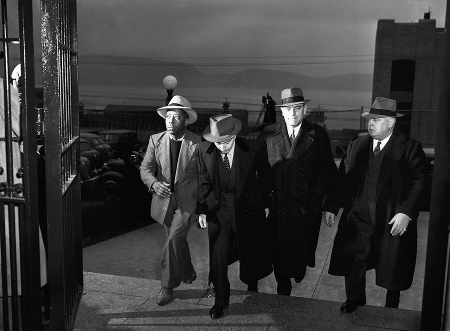 Read moreIn 1939, German-American Bund leader Fritz Kuhn was convicted of embezzlement, and sent to prison. While there, his citizenship was revoked, and he was later interned in a federal camp in Texas as an enemy alien. He was later deported to Germany in 1945. Here, handcuffed to two other prisoners, Kuhn (third from left), walks into Sing Sing Prison in Ossining, New York, on December 6, 1939, to begin serving his sentence. Sheriff Mathew Larkin, right, of New York county, is escorting the prisoners. #