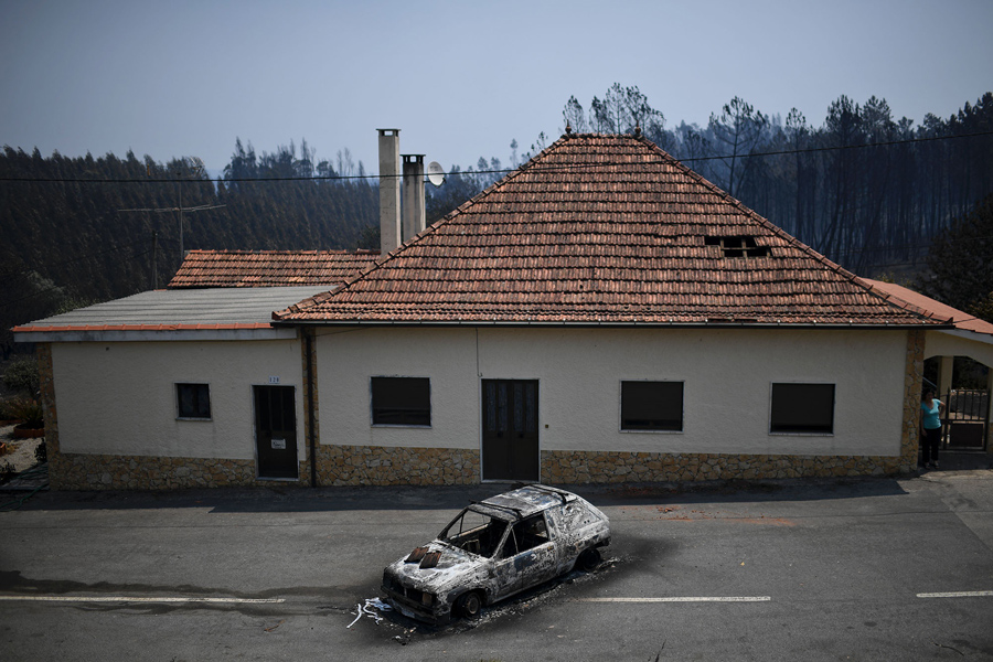 Read moreA picture taken on June 18, 2017 shows a car burned in front of a house after a wildfire in Figueiro dos Vinhos. #