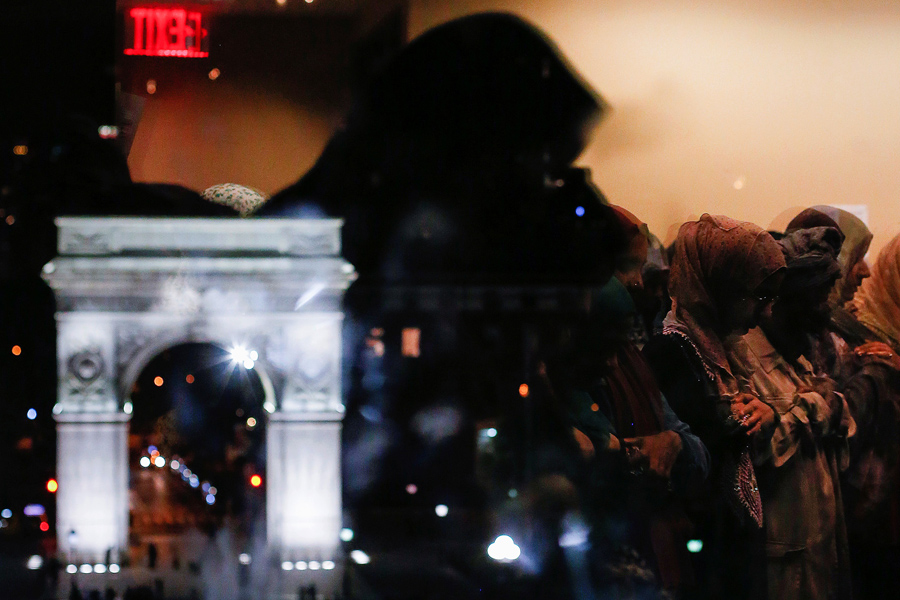 Read moreWashington Square Arch is seen on the left as Muslim women praying Tarawih prayers are reflected in the window of the Islamic Center at New York University ahead of Ramadan in Manhattan, New York, on May 26, 2017. #
