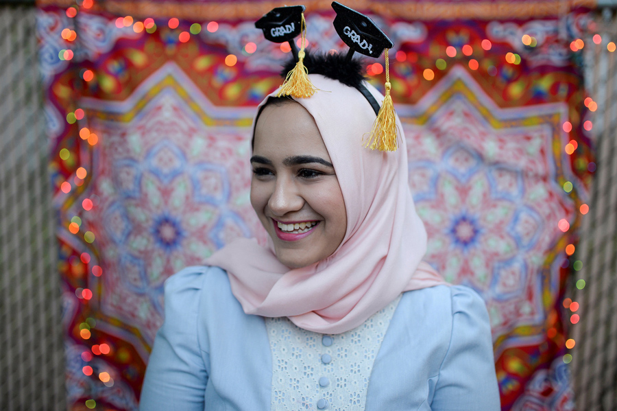 Read moreDina Sayedahmed, an Egyptian American with a major in journalism and political science from Rutgers University, smiles as she stands in front of a makeshift photo booth in her family's backyard ahead of a graduation celebration and Iftar feast during Ramadan in Bayonne, New Jersey, on June 2, 2017. #