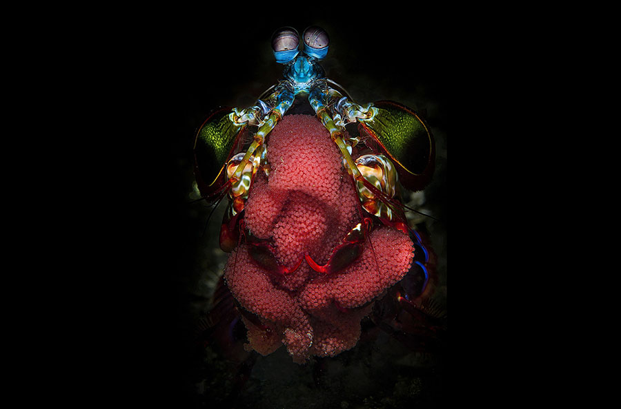 Read moreMantis Mom, Aquatic Life Winner. Surrounded by black volcanic sands, a peacock mantis shrimp (Odontodactylus scyllarus) stands guard over her ribbon-like mass of fertilized eggs. The folds of this portable, flexible structure—held together with an adhesive produced by the mother—provide ample surface area for gas exchange between the egg membranes and the surrounding environment. The female cleans and aerates the developing eggs with the same appendages she typically uses to handle prey. With her limbs more than full caring for her brood, the female won’t eat until the eggs hatch and the larvae disperse. Photographed in Lembeh Strait, Indonesia. #