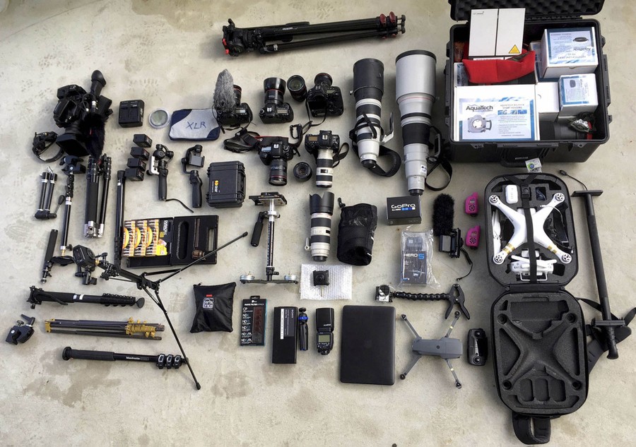 Read morePhotography and video equipment brought along by an Associated Press team on assignment aboard the Finnish icebreaker MSV Nordica is laid out on the ship's deck on July 8, 2017, while sailing toward the Bering Strait in the North Pacific Ocean. #