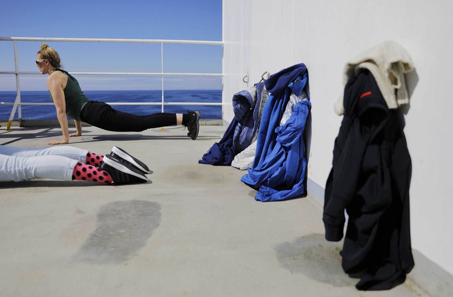 Read moreResearchers Tiina Jaaskelainen, right, and Daria Gritsenko do yoga in the warm weather aboard the Finnish icebreaker MSV Nordica as it sails the Bering Sea on July 13, 2017. #
