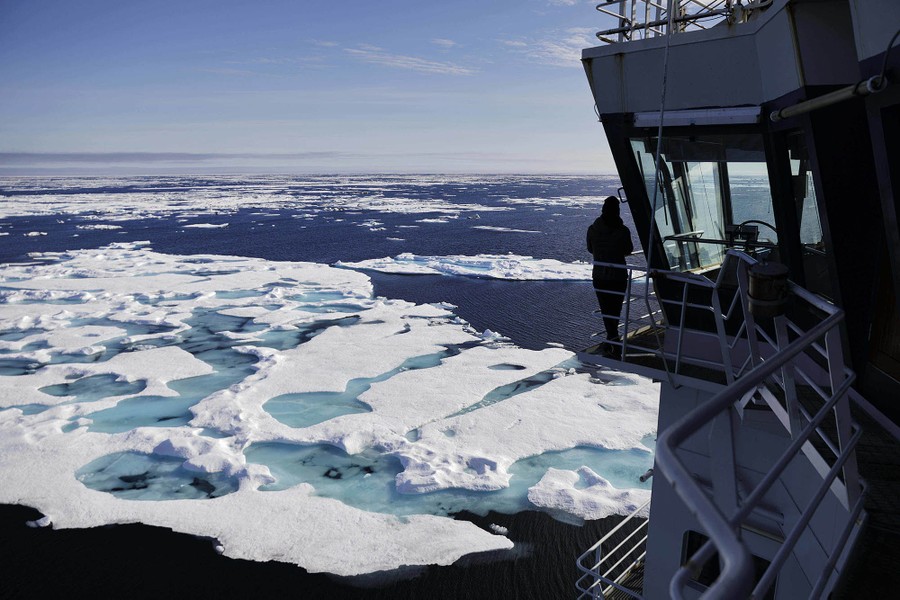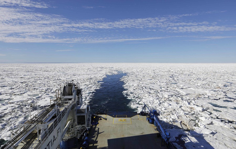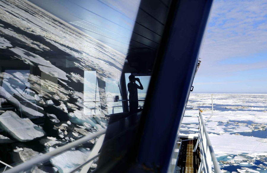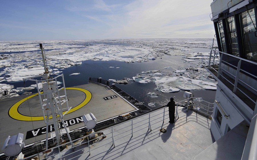 The Finnish icebreaker MSV Nordica just set a new record, sailing through the Northwest Passage above North America earlier than ever before. It took 24 days at sea to travel the 6,215 miles (10,000 kilometers) from Alaska to Greenland, arriving on July 29. Arctic sea ice has been melting sooner every year, opening the route earlier and for a longer time each summer. A team from the Associated Press accompanied a group of international researchers aboard the MSV Nordica, including photographer David Goldman, who returned with the photos below.