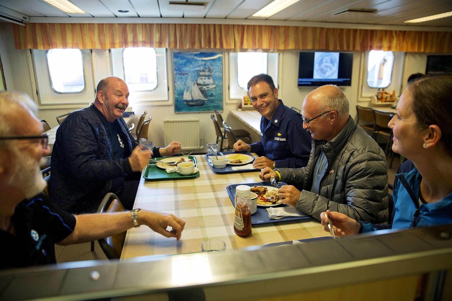 Read moreIce navigator Captain David "Duke" Snider, from left, Canadian Coast Guard Captain Victor Gronmyr, U.S. Coast Guard Commander Bill Woityra, assistant ice navigator Nigel Greenwood, and biologist Paula von Weller talk over dinner in the mess hall aboard the MSV Nordica on July 10, 2017. #