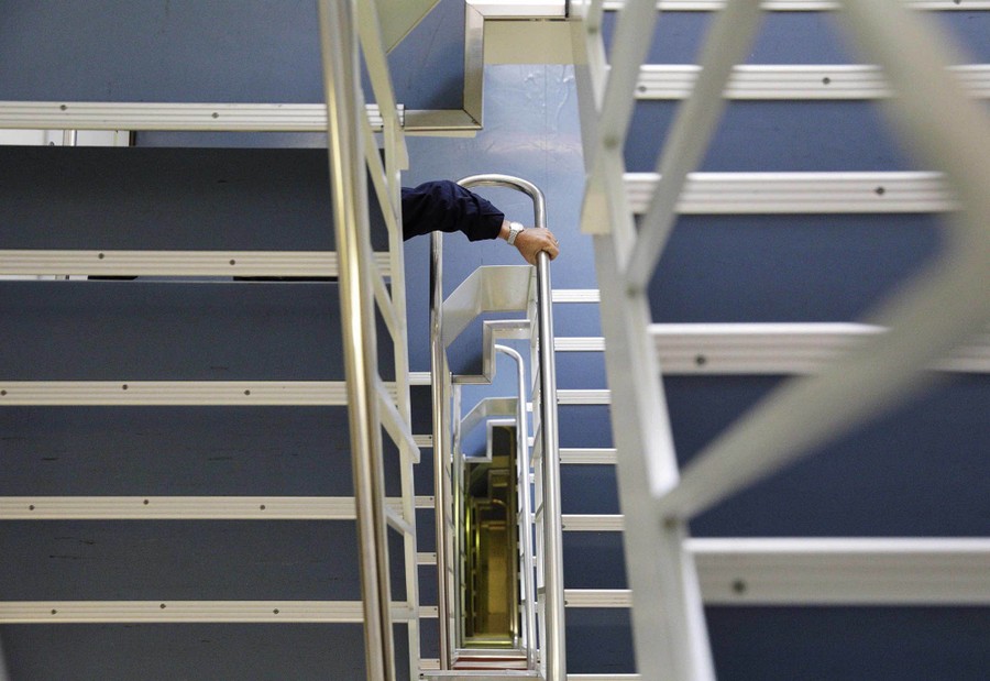 Read moreNigel Greenwood, assistant ice navigator and retired Royal Canadian Navy rear admiral, climbs down the six flights of stairs from the bridge to the mess hall for dinner aboard the MSV Nordica on July 12, 2017. #