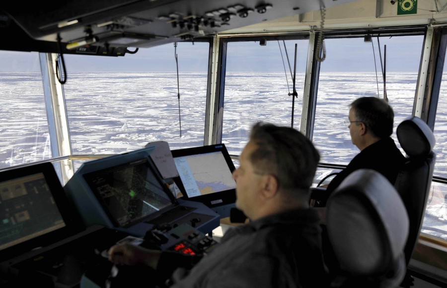 Read moreJyri Viljanen, left, captain of the Finnish icebreaker MSV Nordica and Harri Venalainen, chief officer, navigate from the bridge through ice floating on the Chukchi Sea off the coast of Alaska on July 16, 2017. #