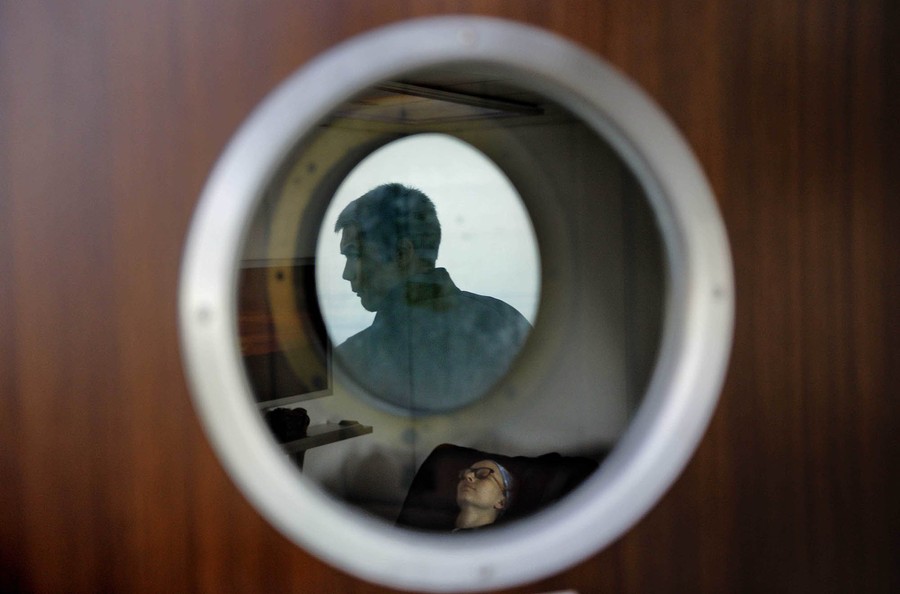 Read moreIn this July 13, 2017, photo, trainee David Kullualik is reflected in a deck door window looking out to sea as researcher Ilona Mettiainen reclines in a massage chair aboard the MSV Nordica. #