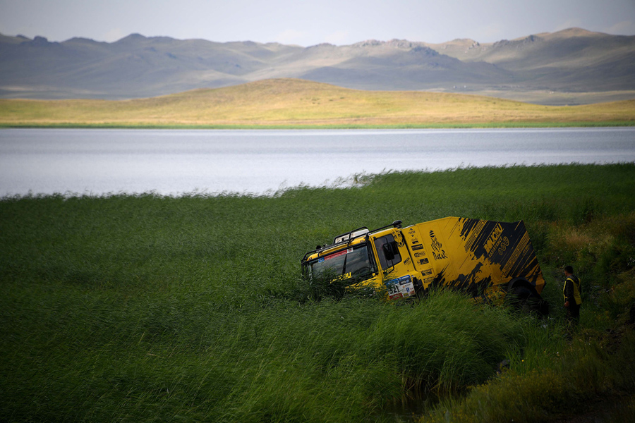 Read moreJapanese truck's driver Teruhito Sugawara and co-driver Hiroyuki Sugura stand next to a vehicle which fell off a road in Stage 2 between Tcheboksary and Ufa, Russia, on July 9, 2017. #