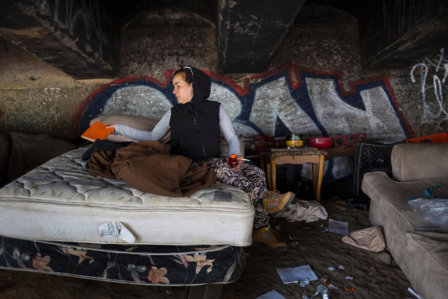 Read moreJessica, a homeless heroin addict, arranges some belongings around the spot under the bridge where she lives in Kensington, Philadelphia, on April 14, 2017. "Eighty percent of us want to get out," said Jessica, before outlining the numerous ways she has tried to get treatment for her addiction. In one case, she said, there weren't any available beds. In another, a treatment provider required a positive drug test before delivering aid, meaning if she hadn't used recently, she'd be denied. Instead of getting treatment, she spends her nights trying to keep warm on a mattress under a bridge in the very spot where she was raped and infected with HIV. #