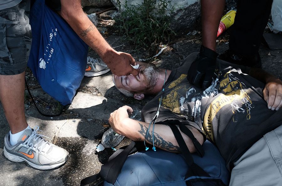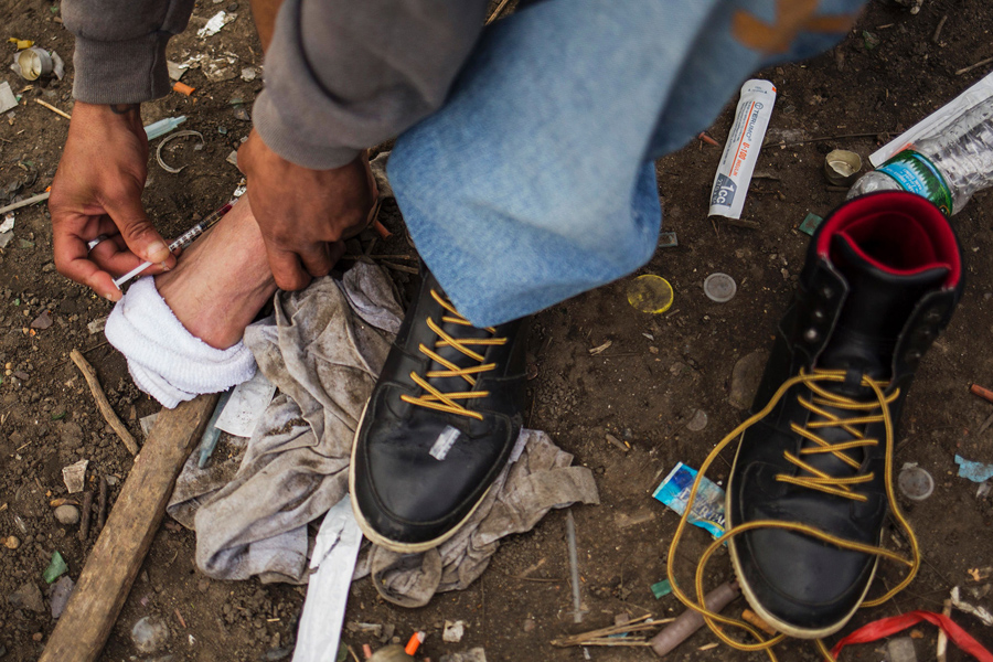 Earlier this year, AFP photographer Dominick Reuter and Getty photographer Spencer Platt both visited the Kensington neighborhood in Philadelphia, Pennsylvania, to photograph “El Campamento,” one of the largest open-air drug markets and shooting galleries on the East Coast, before it was shut down. According to Getty: “People come from throughout the city, and some as far away as the Midwest, for heroin that is remarkably cheap and pure.” At the end of July, the encampment, littered with mattresses, used needles and other refuse, started to be cleaned up and closed down by city workers and Consolidated Rail employees, while outreach workers try to help place homeless residents of the camp. Getty further reported that “over 900 people died last year in Philadelphia from opioid overdoses, a 30 percent increase from 2015.”