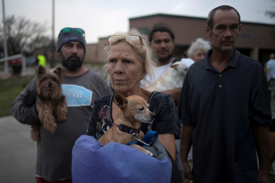 Read moreA couple of evacuees carry their dogs into the the George R. Brown Convention Center after Hurricane Harvey inundated the Texas Gulf coast, in Houston, Texas, on August 27, 2017. #