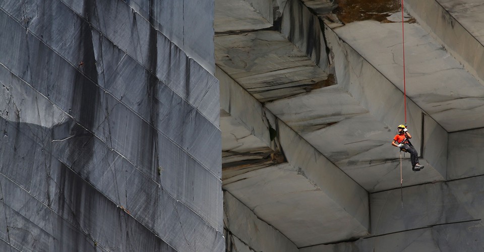 Read moreA worker, known as a tecchiaiolo, examines marble at the Cervaiole quarry on Monte Altissimo in the Apuan Alps, Tuscany, Italy, on July 18, 2017. Before the extracting begins, these experts hang from ropes and pick at the sides of the mountain with pointy iron bars to remove loose rock that could fall and hurt workers in subsequent phases of the extraction. #