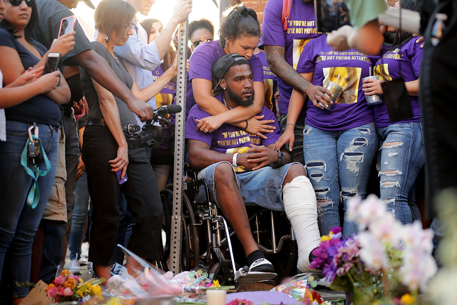 Read moreMarcus Martin (center), who was injured when a car plowed into a crowd of people protesting against the white supremacist rally, his wife Marissa Blair (behind with arms around Marcus) and friends visit the memorial built at the place where he was injured and where where 32-year-old Heather Heyer was killed in the same attack August 13, 2017 in Charlottesville. #