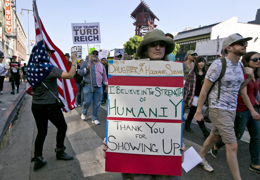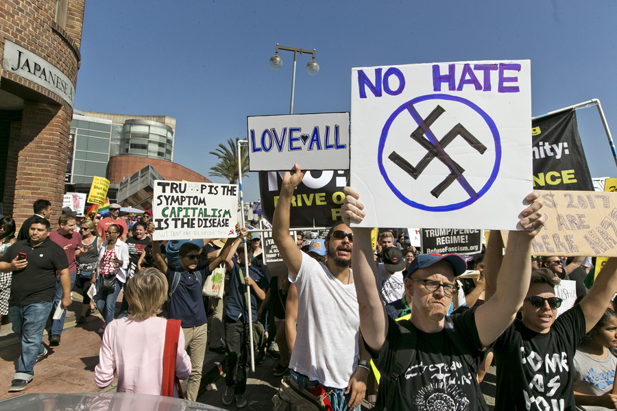 Read moreDemonstrators march in downtown Los Angeles on August 13, 2017. Protesters decrying hatred and racism converged around the country Sunday, the day after a white supremacist rally that spiraled into violence in Charlottesville. #