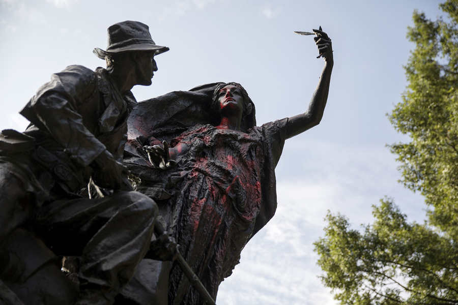Read moreA statue depicting a Confederate soldier in Piedmont Park in Atlanta, after being vandalized with spray paint on August 14, 2017, from protesters who marched through the city last night to protest the weekend violence in Charlottesville, Virginia. #
